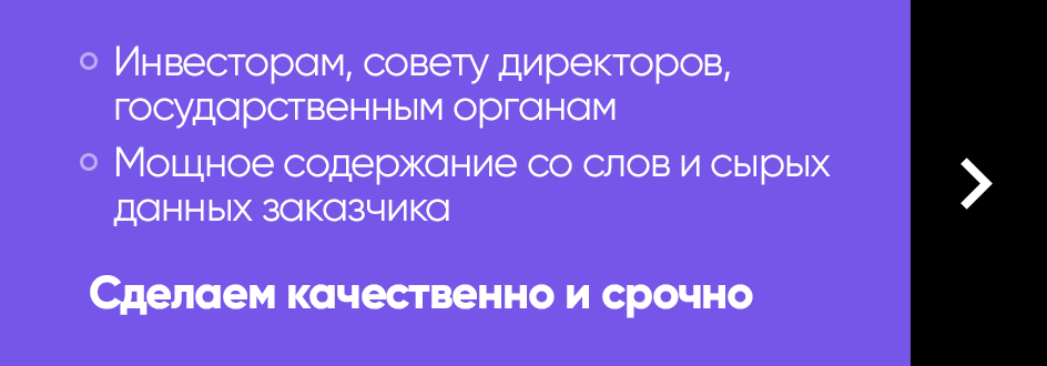 Презентация амбициозного проекта должна быть мотивирующей и яркой. Вместе с тем, любое необоснованное или непрофессиональное заявление способно разрушить доверие зрителей. Мы пишем тексты докладов, которые руководители крупнейших российских компаний готовы рассказывать слово-в-слово.